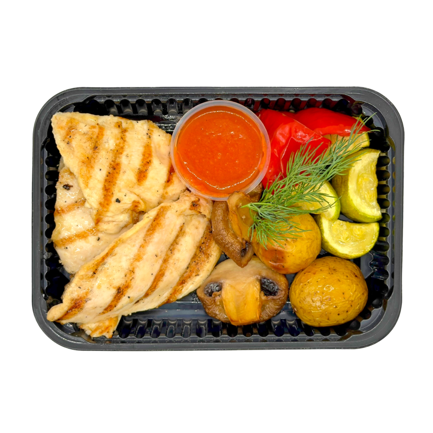 Куриная грудка, Растительное масло, Специи, Соус, Гарнир на выбор