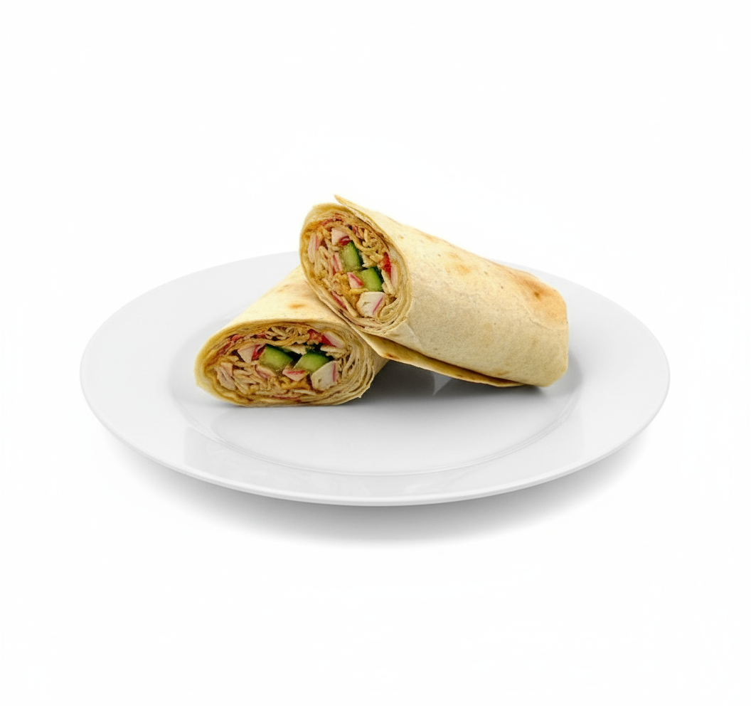 Крабовое мясо "имитация", свежий огурец, фирменный соус терияки, кунжутное масло, армянский лаваш