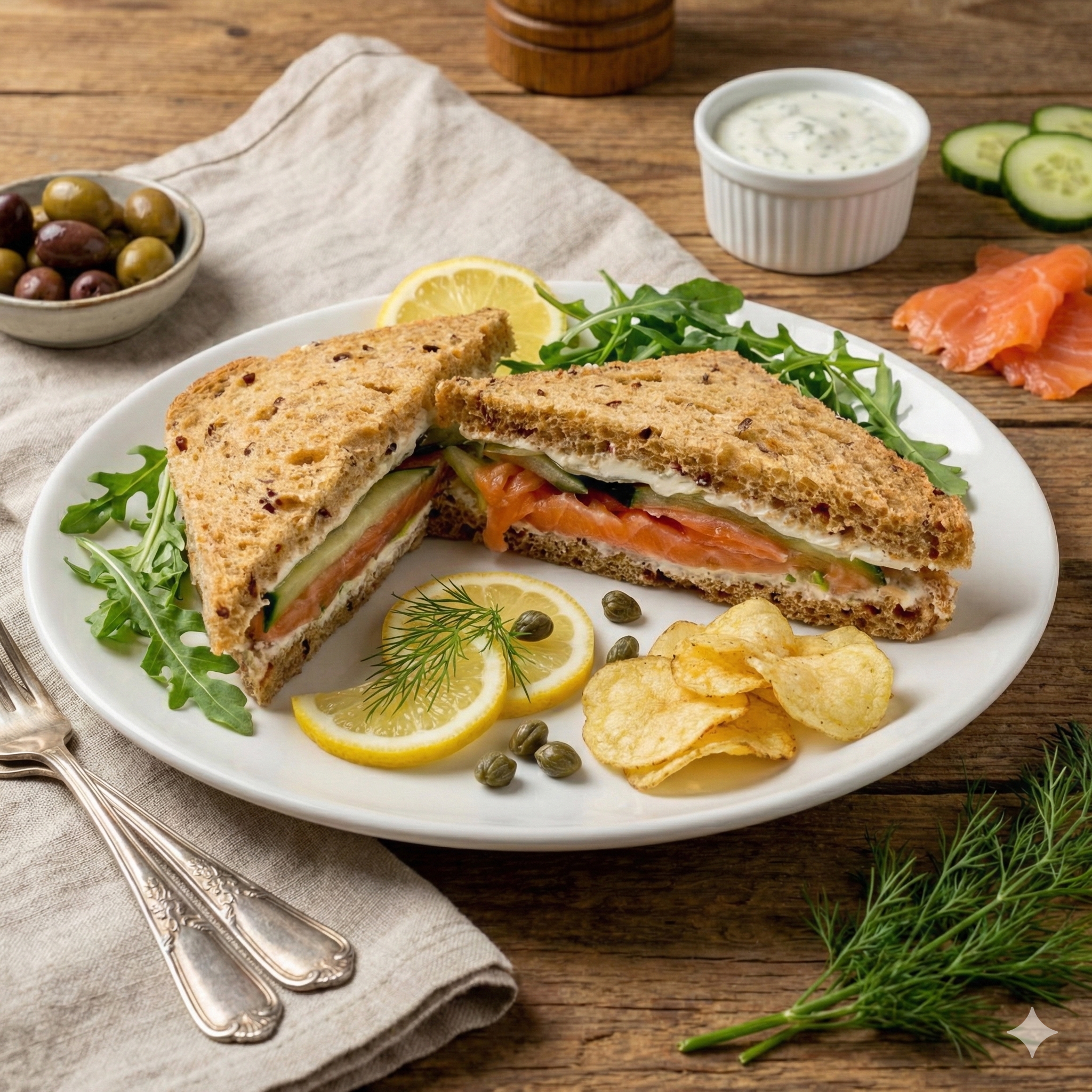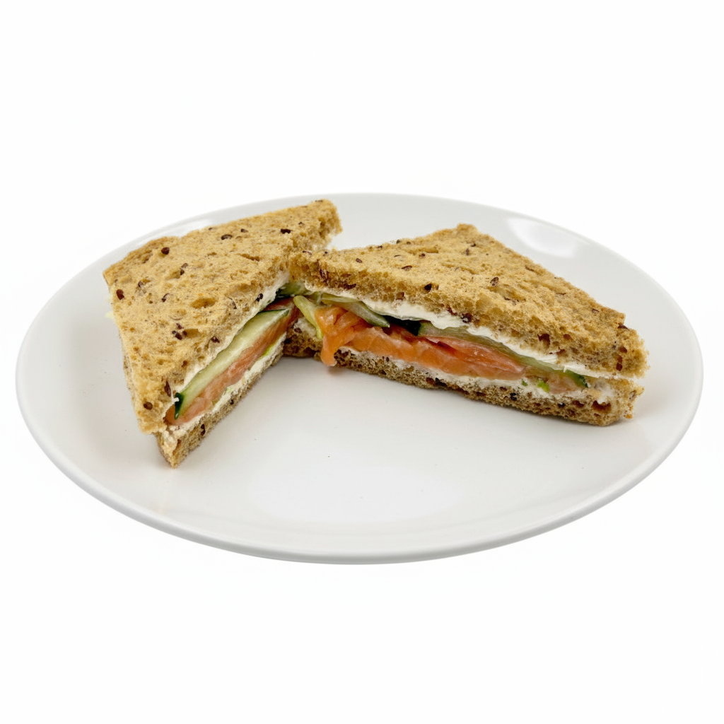 Слабо-соленый лосось собственного посола, салат , сливочный сыр "Креметта", свежий огурец, зерновой хлеб